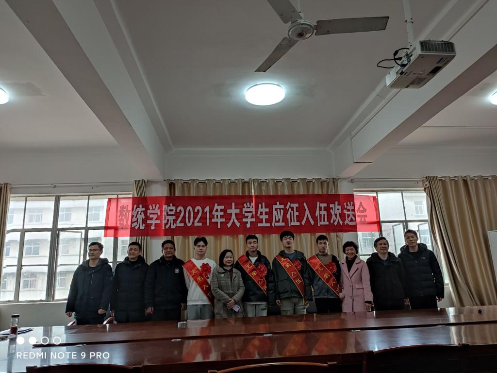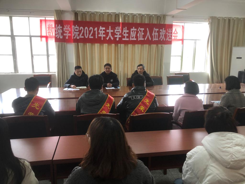 2021年3月11日下午,Beat365官网在三楼会议室隆重召开2021年大学生征兵入伍欢送会,院长胡付高、党总支书记林先安、党总支副书记艾明星、征兵辅导员吴舒展、班主任老师刘伟超、余胜平、吴庆华及全体入伍新兵参加欢送会。欢送会由艾明星主持。