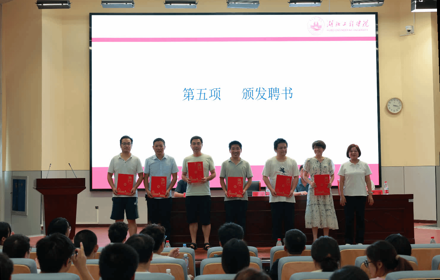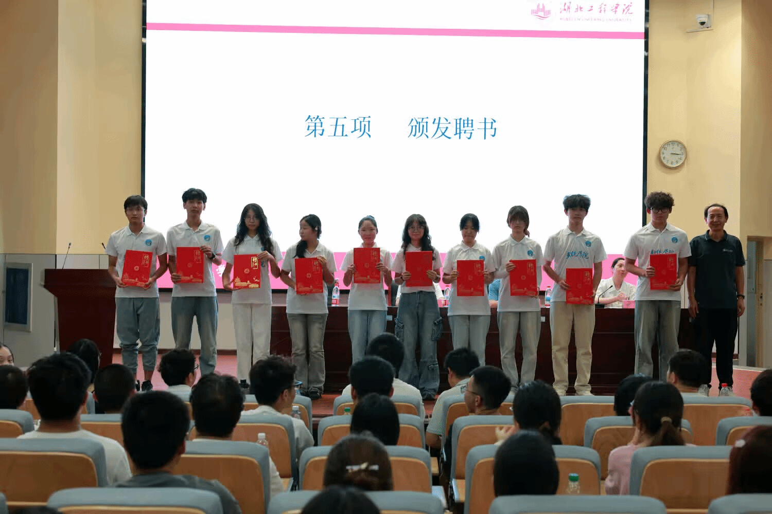 典礼现场先举行聘书颁发仪式。学院领导为新生班主任、新生班级助理颁发聘书,以肯定其工作,同时期待他们助力新生平稳适应大学生活。