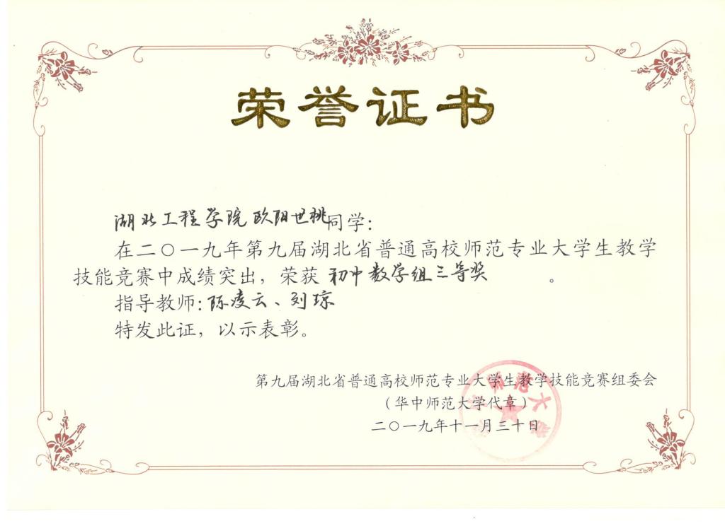 11月29日到12月1日,湖北省第九届师范生教学技能竞赛在华中师范大学举行。Beat365官网王芳、欧阳世桃二位同学分别获得高中数学组、初中数学组三等奖的骄人成绩。