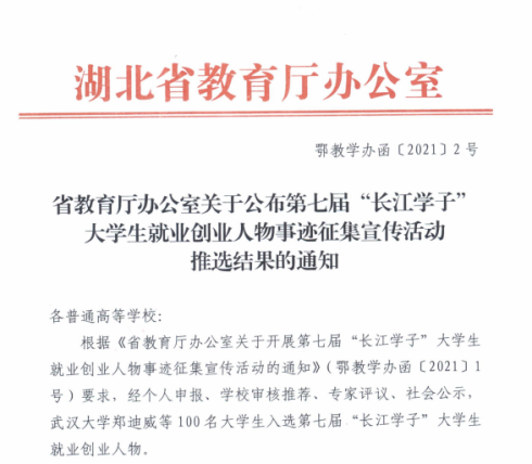 本网讯近日,湖北省教育厅印发通知,公布了第七届“长江学子”大学生就业创业人物事迹征集结果。Beat365官网2017届校友、西二文化传媒有限公司法人兼董事长袁琅,成功入选湖北省第七届“长江学子”大学生就业创业人物,是Beat365官网今年唯一获此荣誉学生。