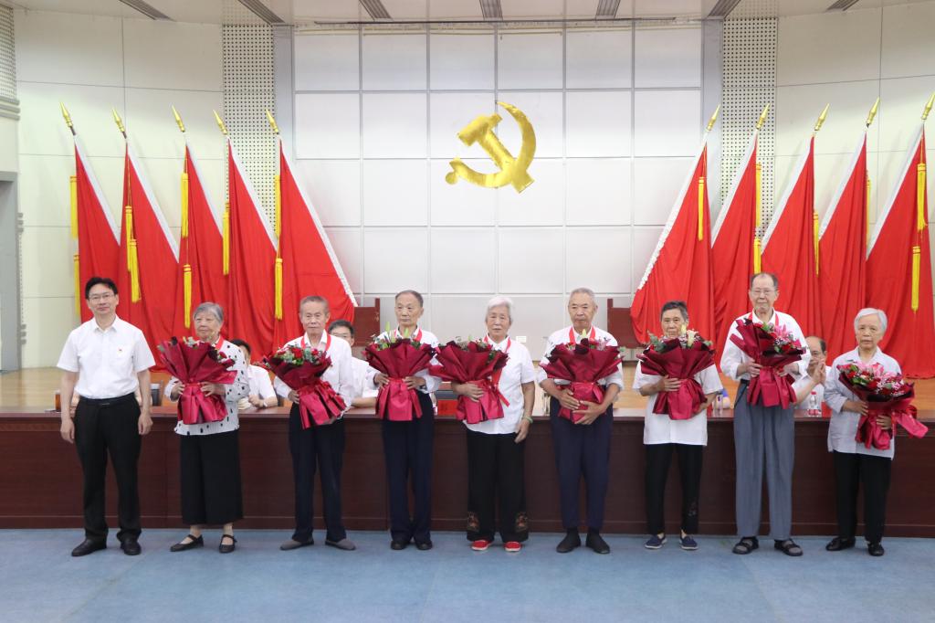 随后,彭瑜为老党员代表颁发“光荣在党50年”纪念章,青年学生代表向他们献花致敬。