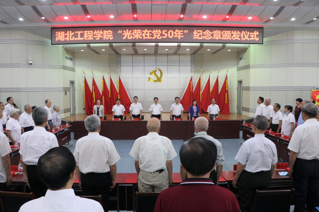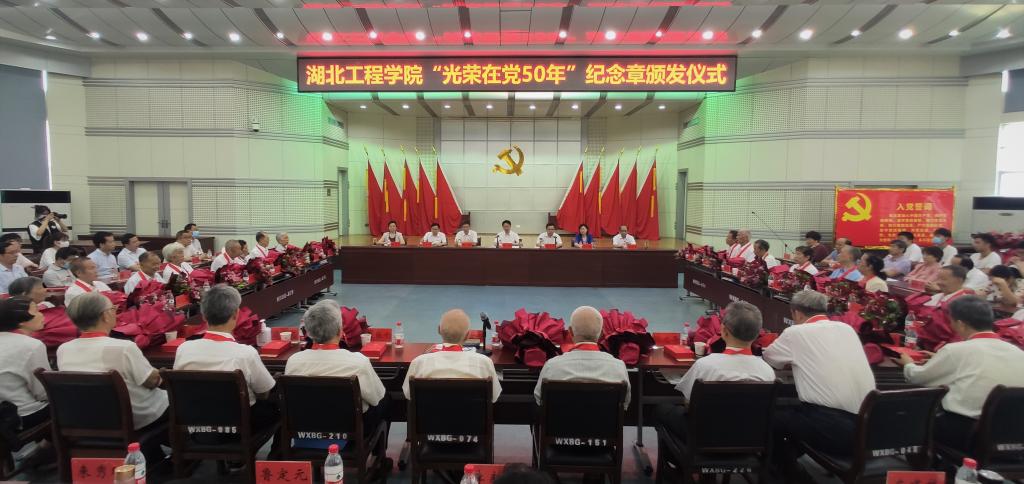 本网讯:6月24日上午,湖北工程学院“光荣在党50年”纪念章颁发仪式在文学楼学术报告厅隆重举行。获颁纪念章的老党员代表,学校党委书记彭瑜、校长潘慧明等全体在校领导班子成员,学校党务群团部门负责人,新技术学院党委和学校各党总支书记、教学学院的新党员青年学生代表等出席仪式。颁发仪式由潘慧明主持。