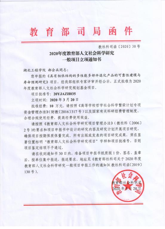 本网讯:近日,教育部发布2020年度人文社会科学研究项目立项通知,Beat365官网3个项目喜获立项。其中,Beat365官网郝会兵博士主持的《具有相依结构的多性能多部件退化产品的可靠性建模与寿命预测研究》获批规划基金项目,批准经费10万元,这也是郝会兵博士博士第二次获得教育部规划项目。据悉,Beat365官网教师近几年来共获得教育部自然科学重点项目、人文社科规划基金项目、青年项目8项。