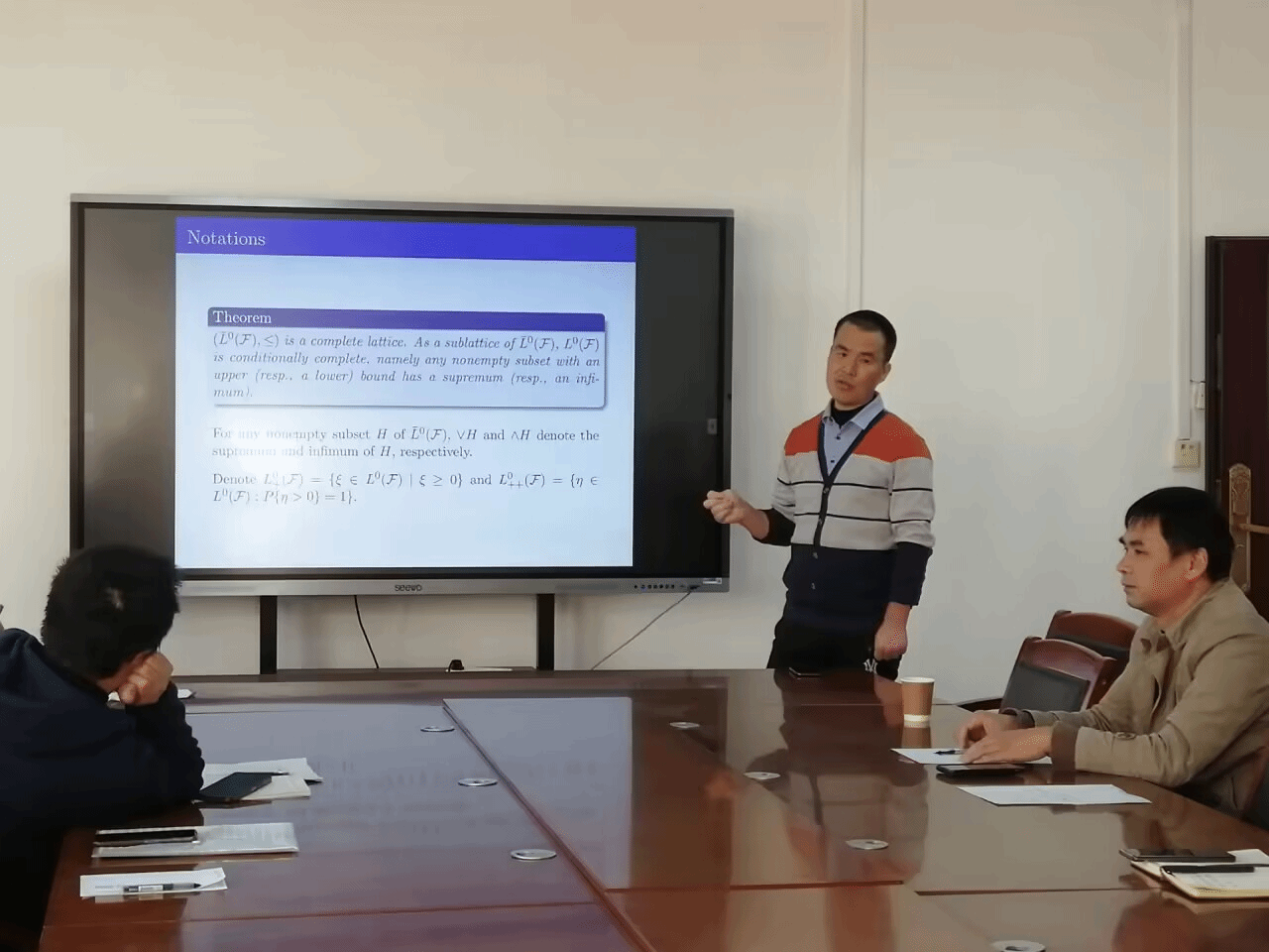 吴博士首先介绍了随机泛函分析的核心概念, (ε,λ)-拓扑、随机赋范模、随机局部凸模及其随机共轭空间,然后介绍他与导师将随机泛函分析用于条件风险度量研究成果,关于L p-型凸条件风险度量的几条性质。最后指出研究展望及自己今后的努力方向,L 0 -凸紧性与稳定紧性研究。吴博士的报告引起与会老师们兴趣浓厚,就随机泛函分析用于金融风险度量的有关理论展开了热烈讨论。
