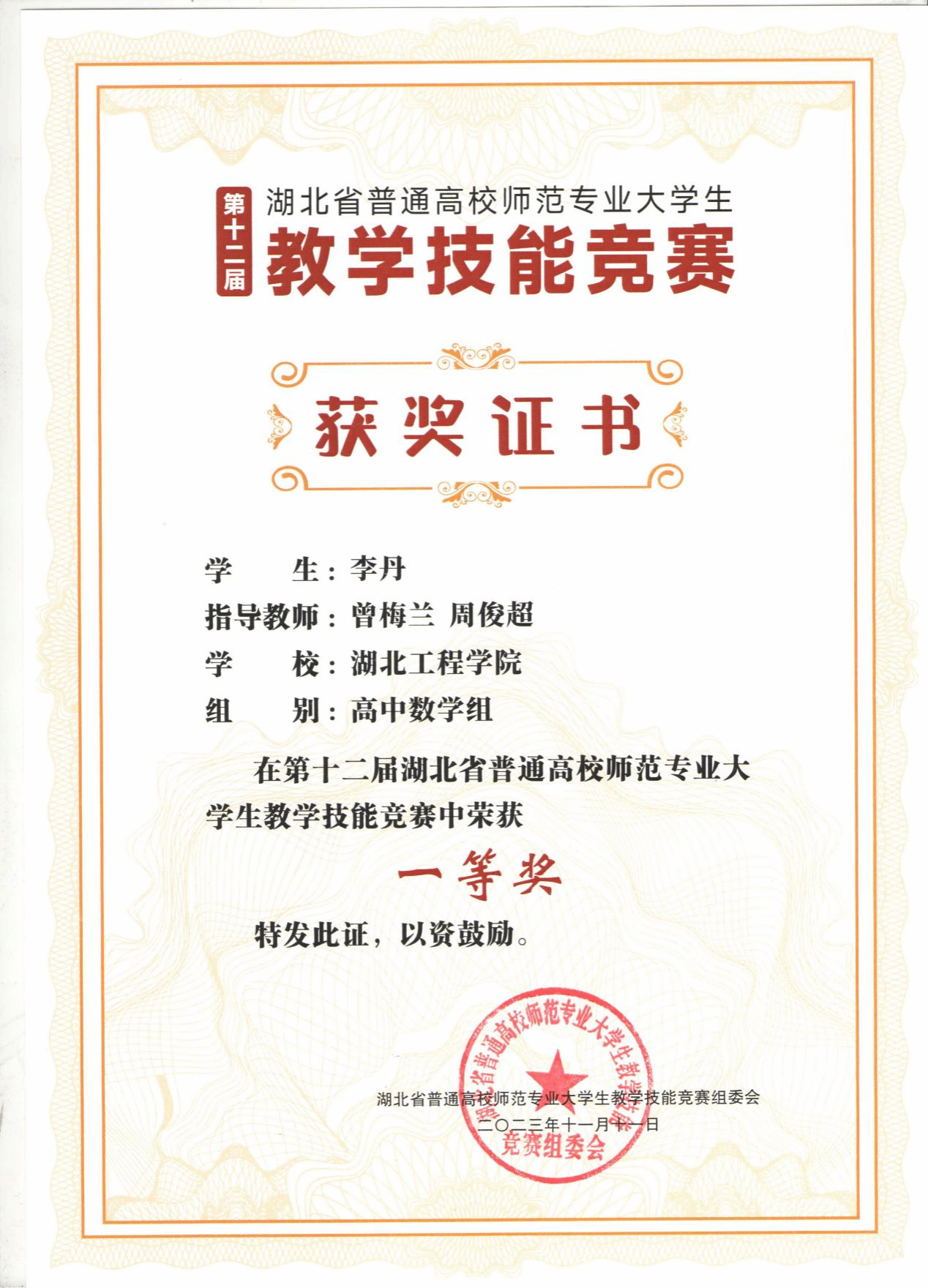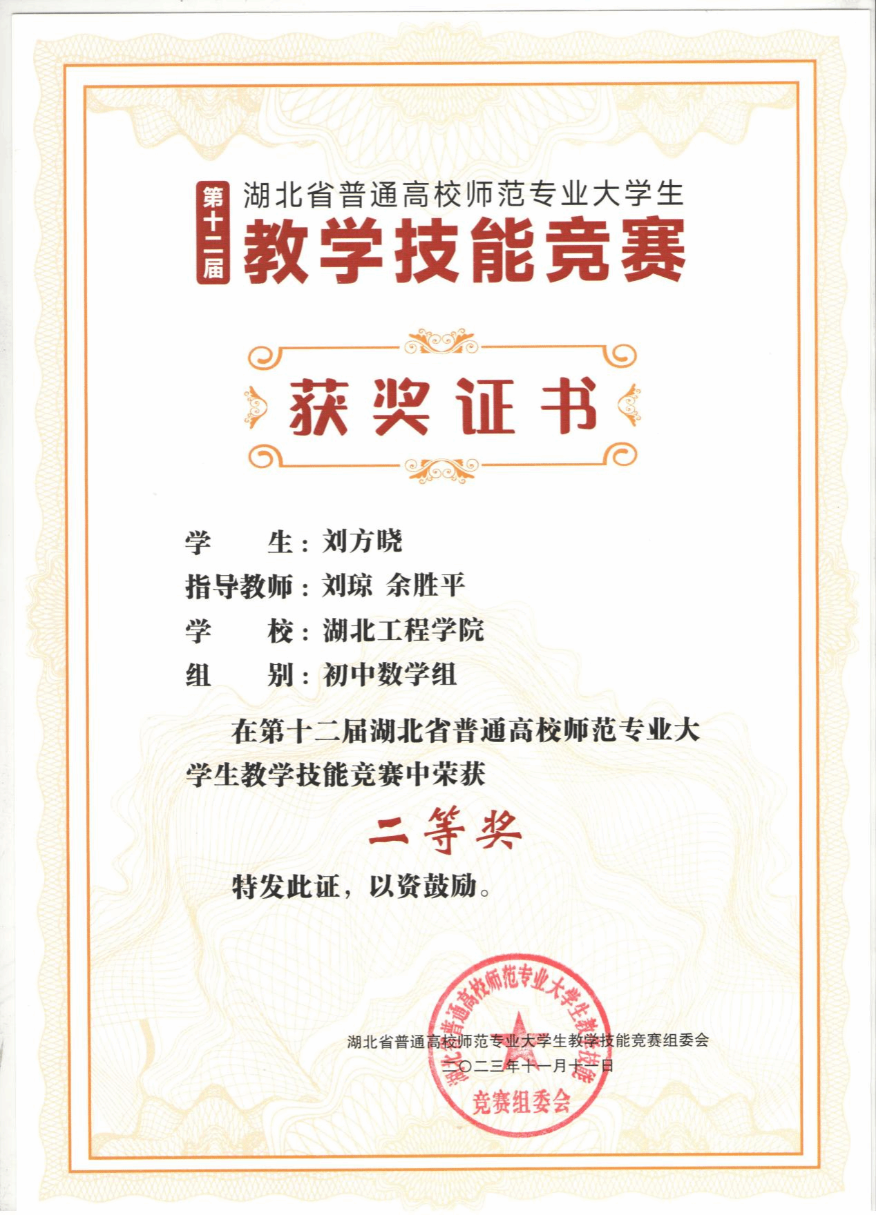 2023年11月11日,第十二届湖北省普通高校师范专业大学生教学技能竞赛决赛在华中师范大学圆满落幕,Beat365官网两名数学与应用数学专业学生在全省十几所参赛高校中脱颖而出,创Beat365官网参加此项赛事以来最好成绩,其中李丹获得高中数学组一等奖(指导老师:曾梅兰、周俊超),刘方晓获得初中数学组二等奖(指导老师:刘琼、余胜平),充分展现了Beat365官网数学与应用数学专业学生扎实的专业知识、教学技能和综合素养。